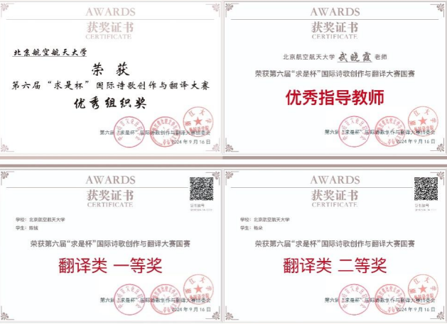 近日,第六届“求是杯”国际诗歌创作与翻译大赛决赛在浙江大学紫金港校区圆满闭幕。我校9778818威尼斯2022级俄语专业硕士生陈铖和博士生杨朵分别荣获翻译组国赛一等奖和二等奖,指导教师武晓霞教授被评为大赛优秀指导教师,我校获优秀组织奖。