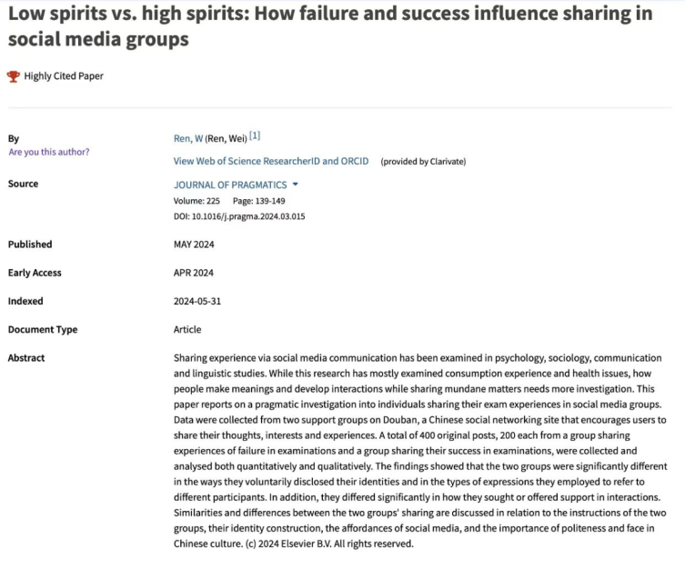 近日,据“基本科学指标数据库(Essential Science Indicators,简称ESI)”发布的最新数据显示,9778818威尼斯任伟教授发表于国际顶尖期刊《Journal of Pragmatics》(《语用学杂志》)的学术论文“Low spirits vs. high spirits: How failure and success influence sharing in social media groups”成功入选全球“高被引论文(Highly Cited Paper)”。